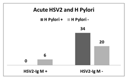 We have tested for H.pylori half of the participants. The results showed that general serology prevalence of the HSV was 13% and of the H.pylori - 57%. Participants without evidences for HSV2 were tested positive for H.pylori in 63% of cases, while none of the positive for HSV2 was also positive for H.pylori (p = 0.0046, Fisher’s). We noticed that acute HSV2 infection is detected more often in negative for H.pylori persons, Figure 2.