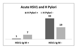The same pattern is apparent when comparing HSV1 acute vs lack of HSV infection. Subjects with acute infection were less prone to be positive for H.pylori (1/8 vs 33/52, p=0.0164, Fish-er’s) (Figure 3), There is an open question if H.pylori might play protective role against other infections. That question has been raised in some previous papers focused on local interactions between viruses and bacteria in gastric mucosa. It has been shown that peptic ulcer patients who were positive for HSV-1 were more likely to be negative for H.pylori. Furthermore, authors found an inverse association between HSV-1 and H. pylori infection in Greek adult population.6 On the contrary, another study among US adolescents revealed that HSV-1 seropositivity is associated with a higher H. pylori seroprevalence. The study was not able to found biological reasons and concluded that shared routes of transmission might explain the observation (7). Our data showed the opposite association, which could be consequence of local immune interactions or kind of more sophisticated interplay of the host immune responses.