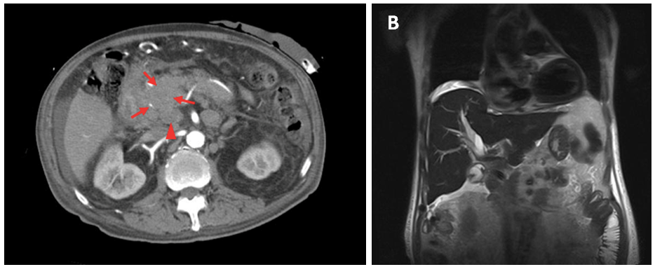 The laboratory tests showed hemoglobin 9.7 g/dL; creatinine 1.0 mg/dL; amilase 481 IU/L (<118); lipase 506 IU/L (<51); aspartate aminotransferase (AST) 68 IU/L (<34); alanine transaminase (ALT) 49 IU/L (10-49); total bilirrubin 21.2 IU/L (0.2–1.0) with conjugated fraction predominance (17.8 mg/dL); alkaline phosphatase 477 IU/L (45-129); albumin 3.1 g/dL (3.5–5.5); total prostatic specific antigen (PSA) 15.5 ng/mL; Ca19.9 >1200 IU/L (0-37); CEA 4.6 IU/mL (0-3); prothrombin time (PT) 15.8 (<13); partial thromboplastin time (TTP) 38.4 (<37).