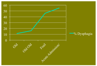 Dysphagia is not infrequent in those residing in the community. Various studies have noted a frequency of up to 30% of older people living at home,15 28% of ole people undergoing instrumentation (FEES;Videofluoroscopy) are shown to aspirate.16,17 With increasing dependency and illness the prevalence of dysphagia increases (Figure 1).