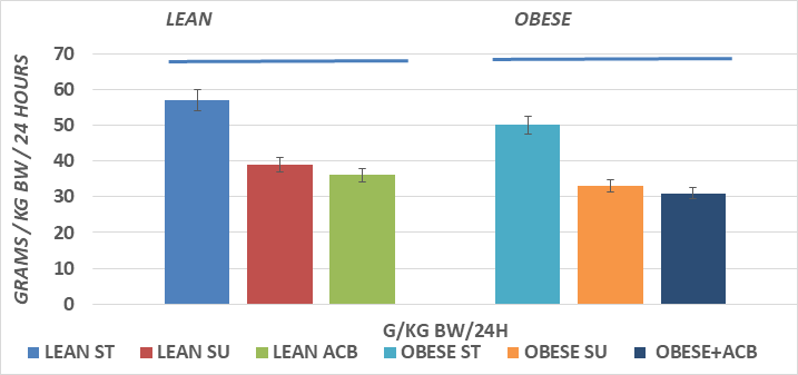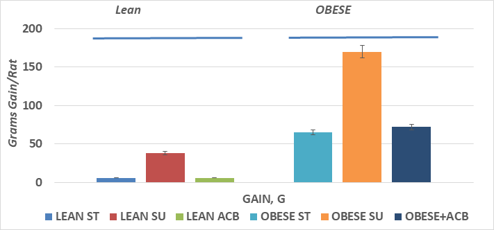 Body weights and net weight gain of rats are depicted in Figure 1 respectively and indicate that the obese+NIDDM rats were heavier than their lean littermates and gained more weight during the 8 weeks of the study. He inclusion of Acarbose in the SU diet resulted in less weight gain, with net weight gains in both phenotypes that were of a similar magnitude as control animals fed the ST diet. The obese+NIDDM phenotype consumed significantly more food per day than their lean littermates (Obese+NIDDM = 70±6g/d vs Lean 46±4g/day, Figure 2A), while food intake relative to body weight was greater in lean than obese and was not affected by the ACB regimen (Figure 2B). Rats of both phenotypes gained more weight than rats of the same phenotype when consuming the SU vs, the ST diet. The daily food intake, reported as grams of diet consumed per kilogram of body weight are depicted in Figure 2B, and indicate that when expressed relative to body weight, animals of both phenotypes consumed more food per day relative to their body weights when fed the ST than the SU diet, and that the ACB diet was without significant effect on relative daily food ingestion in either phenotype. In addition, while obese rats typically demonstrated frank hyperphagia, but when expressed per unit of body weight, lean rats tended to consume modestly greater food intake relative to their body weights daily than their obese+NIDDM littermates, and consumed more when fed the ST than the SU or ACB dietary regimens, consistent with a CHO type effect on appetite, and that the ACB additive did not appear to affect net parameters of overall appetite in either phenotype.