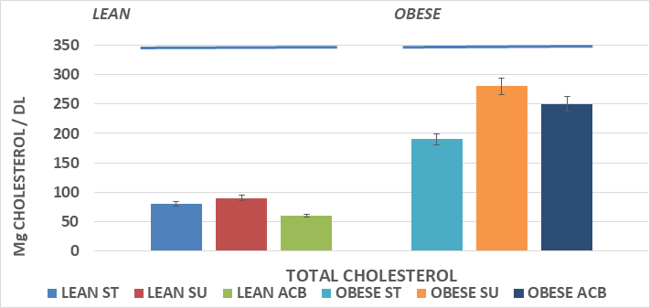 Serum total cholesterol concentrations are depicted in Figure 3 and indicate that total serum cholesterol was greater in the obese than the lean phenotype, and that the SU diet regimen resulted in a significantly greater serum cholesterol concentrations in the obese but not in the lean phenotype, where the serum cholesterol tended to trend only slightly greater in the lean SU group. The addition of ACB resulted in modestly lower serum cholesterol concentrations in both phenotypes but did not fully normalize the hypercholesterolemia in the obese+NIDDM phenotype. Serum Alpha and Beta lipoprotein concentrations are depicted in Figure 5A, and indicate that Alpha lipoprotein concentrations, corresponding to low density lipoprotein cholesterol (LDL) fractions, were greater in the obese+NIDDM phenotype than in their lean littermates, and increased further in both phenotypes in animals feed the SU diet. Addition of the ACB to the SU regimen resulted in a normalization of Alpha LP cholesterol in the lean phenotype but was without significant effect in reducing Alpha lipoprotein levels toward controls in the obese+NIDDM phenotype. Measures of the Beta Lipoprotein cholesterol, corresponding to High Density Lipoprotein cholesterol fractions were greater in the obese+NIDDM than the lean phenotype, and increased further when fed the SU diet in the obese+NIDDM phenotype. The ACB+SU diet resulted in modestly greater Beta-LP concentrations in lean and modestly lower Beta LP concentrations in the obese+NIDDM phenotype. The Alpha to Beta Lipoprotein ratios is depicted in Figure 5B and indicates the alpha to beta lipoprotein ratios were greater in lean than obese rats and were improved toward those of ST-fed rats when fed the ACB diet only in the obese phenotype.