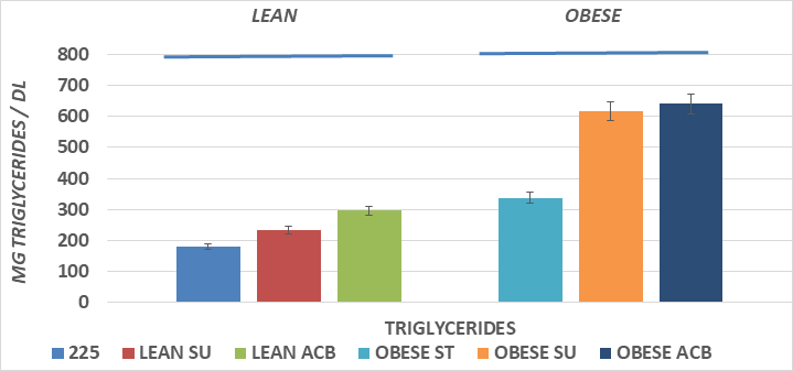 Fasting serum triglyceride concentrations are depicted in Figure 4 and show that the total serum triglyceride concentrations of the obese+NIDDM rats were greater than their lean littermates, and that addition of the SU dietary regimen resulted in further increases n triglyceride concentrations in both phenotypes, with the greatest magnitude in the obese+NIDDM phenotype. The ACB SU diet was ineffective in lowering serum triglycerides in either phenotype.