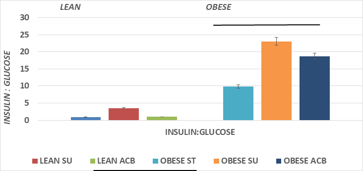 The effects of phenotype and ACB on the fasting Insulin to Glucose ratios at the culmination of the study are depicted in Figure 6 and indicate that the I:G ratios of obese+NIDDM rats were greater than in the lean littermates and increased further when rats consumed the insulinogenic SU diet. The inclusion of ACB in the SU diet resulted in a return toward insulin to glucose ratios observed in ST fed animals of either phenotype but the modest dosage used in this study appeared to be insufficient to bring the insulin concentrations and the insulin to glucose ratios to within a normal range in the obese+NIDDM phenotype.