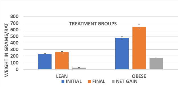 Figure 1 Body weights and net gain of male lean and obese Wistar fatty Rats. Data are mean ±1 SEM, n=3-4 rats/group. Obese > Lean (p=<0.05) and Sucrose diet > starch diet (p=<0.05) in obese phenotype.