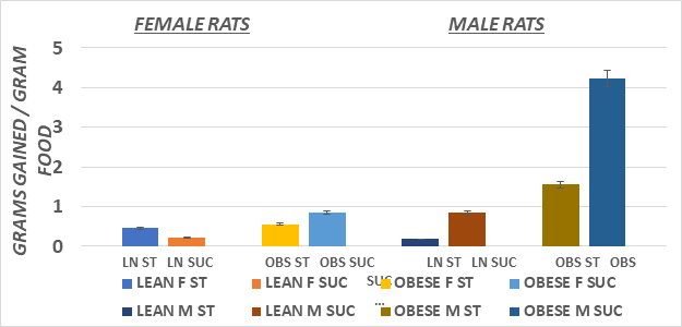 Figure 4 Feed Efficiency of male and female lean and obese Wistar fatty Rats. Data are mean ±1 SEM, males n=6 rats/group; Female n=3-4 rats/group. Suc > Starch diet in Obese males. > p=<0.05).