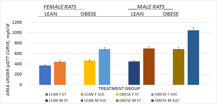 Figure 5 Phenotype on ip Glucose Tolerance in female lean and obese Wistar fatty Rats. Data are mean ±1 SEM, Female n=3-4 rats/group. Obese Sucrose > Starch diet and obese phenotype Sucrose > all other groups.