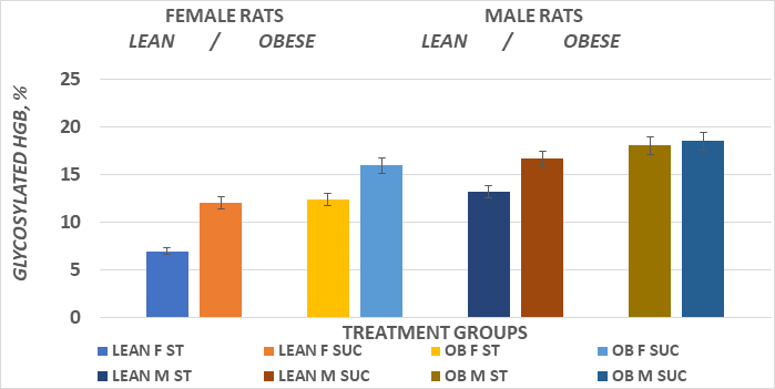 Rats fed a highly palatable diet tend to consume more individual meals, including snacking resulting in more calories daily and then when fed standard rat chow.30 Because the percent of glycosylated hemoglobin in blood is a reflection of the mean plasma glucose concentrations over the projected 120-day lifespan of the mammalian erythrocyte, and occurs via a nonenzymatic, mass-action chemistry process, it is likely to give a higher glycosylated hemoglobin readings then typical when rats are offered highly palatable diets as in the current study, although individual values may vary between laboratories depending on the specific method employed in their measurement.17 Thus, the frequency and carbohydrate type, carbohydrate digestibility and net carbohydrate content consumed during the preceding weeks and months are proposed to contribute to the glycosylation process and can increase or decrease the percent of glycosylated hemoglobin resulting based largely on the above contributing factors. Once the bloods have been collected, it is imperative to store them on ice to decrease potential RBC-mediated glycolytic actions, so as to ensure the plasma glucose concentrations remain preserved, and in addition to any post-collection nonenzymatic glycation remains minimal during the interval between collection and laboratory analysis. Although rats tend to commence much their daily food intake at the onset of the dark phase, they typically behave as grazers, and continue to eat throughout the 24-hour feeding cycle and may exhibit a somewhat higher percentage of glycosylated hemoglobin, even when not exhibiting overt signs of diabetes. In the present study the bloods were analyzed for evidence of glycosylated hemoglobin as soon as practicable, typically within a few hours following collection. The measures observed in the present study are presumed to be a reflection of the previous 8weeks of consuming a highly digestible, high carbohydrate diet in a grazing pattern, and the hyperphagia displayed particularly in the obese phenotype.