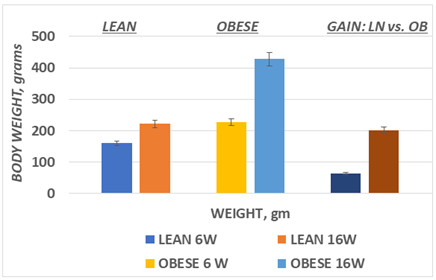The effect of phenotype on initial and final body weight is depicted in Figure 1 and indicate that body weights of the obese phenotype were already greater than in the lean phenotype at the outset and continued to increase at a greater rate thereafter. The net gain of the obese phenotype was significantly greater than in the lean phenotype, exhibiting a rate of weight gain that was more than 3 times greater than their lean littermates consuming the same diet. (p=<0.001).