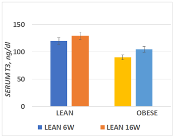 Serum T3 concentrations obtained at 6 and again at 16 weeks of age are depicted in Figure 3 and indicate that serum T3 concentration of lean rats were significantly greater than in the obese phenotype at both ages. In addition, the serum T3 concentrations in both phenotypes tended to be modestly greater at 16 than at 6 weeks of age. Serum T4 concentrations are depicted n Figure 4 and indicate that serum T4 concentrations were similar at both ages and in both phenotypes.