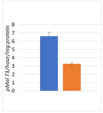 Thus, cellular generation of the availability of T3 via T4–5’ deiodinase plays a critical role in hormonally activating the prohormone T4 to hormonally active form of T3 via enabling an outer ring 5’ deiodination to form hormonally active T3.2–6 Once present, T3 can then displace the T3 corepressor and occupy the TRE. The peripheral availability of plasma T3 concentrations are also dependent on the activity of deiodinase activity in liver and other tissues to generate free T3, which undergoes plasma transport and distribution predominantly via thyroid hormone binding globulins (TBGs), with only small quantities remaining in the TBG free faction. The thyroidal feed–back regulation of thyroidal T4 and T3 formation is based on the plasma concentrations and likely occurs normally, and thus assures adequacy of T4 availability to undergo hormonal activation in liver and other peripheral tissues. The T4 deiodinase enzymes occur in three isoforms, including two outer ring deiodinases termed D–1, D–2 respectively and one inner ring deiodinase (D–3) that can hormonally inactivate the T4 prohormone by catalyzing the deiodination of the inner ring iodine (I) on the 5 position.5 The D–3 deiodinase becomes more active and the D–1 and D–2 deiodinases less active during energy deprivation, starvation, or other metabolic conditions necessitating conservation of energy expenditure.4–6 Thus the purpose of the present study was to determine the hepatic capacity to deiodinate T4 to the hormonally more active form, T3, and to correlate the plasma T3 concentrations and parameters of energy metabolism to the deiodinase actions. In addition, the activation of the TREs requires formation of a heterodimer configuration complex with 9–cis–retinoic acid receptor (RXR) in order to form the most effective TR configuration for genome transcription.1