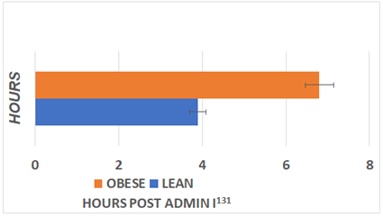 Measures of the rate of 131I–T4 disappearance are depicted in Figure 7 below, and indicate that the half–life of extrathyroidal disappearance of T4 is significantly prolonged in the obese phenotype, nearly twice as long as occurred in their lean littermates. The prolonged half–life occurred despite similar housing, environmental and nutritional diet throughout their lifespan.