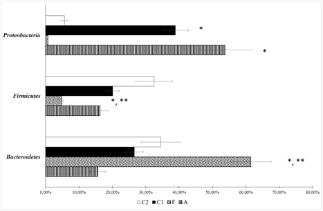 Figure 1 Bacterial composition in the fecal samples of rats from different groups at phylum level (metagenome study).А – Group after correction of experimental intestinal dysbiosis in rats using anaerobic consortium. F – Group after correction of experimental intestinal dysbiosis in rats by autologous fecal transplantation. C1 – control group 1, without correction of experimental intestinal dysbiosis in rats. C2 – control group 2, without induction of intestinal dysbiosis. *P<0.05 when compared with C2 group, ** P<0.05 when compared with C1 group.