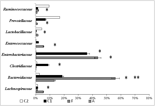Figure 2 bacterial compositions at family level in the fecal samples of rats from different groups (metagenome study).А – Group after correction of experimental intestinal dysbiosis in rats using anaerobic consortium. F – Group after correction of experimental intestinal dysbiosis in rats by autologous fecal transplantation. C1 – control group, without correction of experimental intestinal dysbiosis in rats. C2 – control group, without induction of intestinal dysbiosis. *P<0.05 when compared with group C2, ** P<0.05 when compared with C1 group.