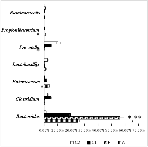 Figure 4 Composition of statistically significant genera of anaerobic bacteria and Enterococcus spp. in the fecal microbiome of rats after dysbiosis recovery. А – Group after correction of experimental intestinal dysbiosis in rats using anaerobic consortium. F – Group after correction of experimental intestinal dysbiosis in rats by autologous fecal transplantation. C1 – control group, without correction of experimental intestinal dysbiosis in rats. C2 – control group, without induction of intestinal dysbiosis. *P<0.05 when compared with group C2, ** P<0.05 when compared with group C1 .