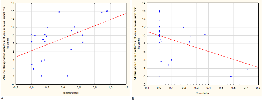 Correlation analysis has demonstrated that there is a direct correlation between Bacteroides representation and maltase activity in small intestine chyme and an inverse correlation for Prevotella (Figure 6).