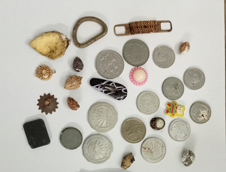 Age distribution of patients shown in Table 1, Foreign body was commonly seen 22 (75.9%) in 1-5 years of age, as shown in Table 1. Table 2 shows sex distribution of foreign body ingestion cases, where 15 (51.7%) were male child. Among the ingested foreign bodies only 3 (10.3%) were removed within 24 hours of ingestion, 10 (34.5%) cases were removed between 24-48 hours and the remaining 16 (55.2%) were removed after 48 hours (Table 3). Coin was the most commonly ingested foreign body 19 (65.5%). Other foreign bodies were metallic chain 3 (10.3%), button battery 2 (6.9%), others 5 (17.2%), (Figure 1 - Figure 3). Most of the ingested foreign bodies were found in the stomach, few were in upper esophagus (Table 4). There were no complications either during endoscopy or after foreign body removal.