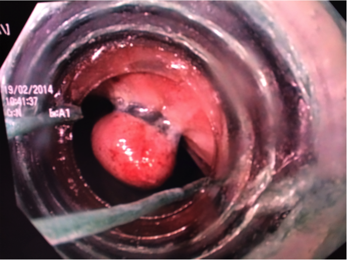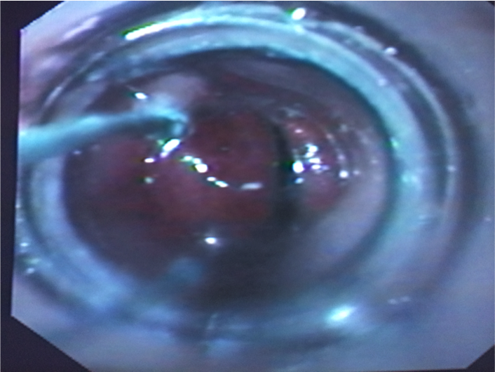 Figure 1 Rubber band ligator applied around a pile column by a video colonoscope using the forward view.