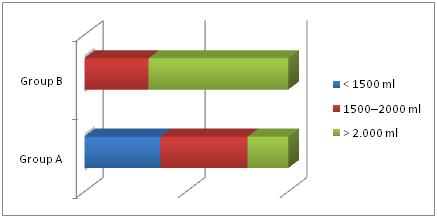 In comparison, intraoperative fluid management in group A was as follows: 37.2% of the patients received less than 1500 cc, 42.8% from 1500 to 2000 cc and the remaining 20%, over 2000 cc. Comparatively, 68.6% of the patients in group B received high volumes (less than 2000 cc), and the rest between 1500 and 2000 cc; no patient in this group received a low volume or less than 1500 cc. There was a significant difference between both groups with p<0.00001 (Table 4 & Figure 2).