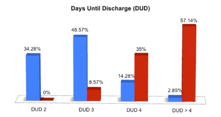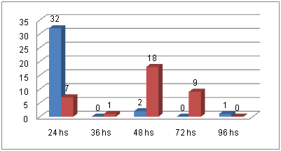 Global hospitalisation time was 3 days (1.5-6) in group A and 4.5 days (3-7) in group B (p<0.0001). Thirty-four percent of the patients in group A (12) were discharged before completing two days of hospitalisation; in group B, there was no record of patient discharges in that period of time. On the third day, 48.6% (17) of the patients in group A were discharged, and in group B 8.6% (3), whereas on the fourth day, 91% (32) of the control patients were discharged, as compared to 17% (6) in group A (Table 5 & Figure 4). One patient in each group was readmitted: in group A due to abdominal pain, with no pathological findings in follow-up studies, being discharged after 48 h. In group B, one patient was readmitted due to fever of unknown origin. There were no records of mortality in the series (Table 6).