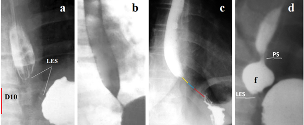 Figure 1 The X-ray image of the LES can be detected in GERD during the high pressure in the stomach, which leads to a reflex contraction of the LES. (a) The LES is visible as a zone without contrast agent between the esophagus and stomach. Knowing the height of L-1 at the age of 9 years (2.1 cm), we assume that the height of D -10 (red) is approximately 1.9 cm. Therefore, the length of the LES is 2.2 cm, i.e. equal to the age norm. (b). In the presence of inflammation, a contrast agent remains inside the LES. The cone-shaped end of the esophagus above the LES is a typical picture with GERD. (c) In a vertical position, 3 parts of the LES are shown in different colors (above the diaphragm - yellow, inside the diaphragm - blue, abdominal - red). (d) Phrenic ampulla (f) indicates a wide lumen of the esophagus. PS (proximal sphincter) is a functional sphincter that occurs with GERD. It contracts with ampullar contraction and closes the ampulla so that when it contracts, it can create high pressure between PS and LES. The LES opens at a threshold pressure and the ampulla injects a bolus