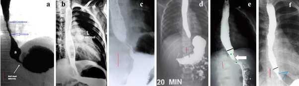 (b) An 18-month-old female child was admitted with the complaints of regurgitation of feed, nonprojectile vomiting, repeated fever, and cough with occasional breathlessness for last 1 year.39 The authors diagnosed EA based on the bird’s beak appearance of the lower end of the esophagus. What the authors call “bird's beak” is an open LES with normal throughput. Analysis. The diagnosis of EA does not have a single confirmatory radiological sign, since the esophagus is not dilated, normal relaxation of the LES does not prevent the filling of the stomach. Based on erroneous interpretation of the X-ray examination, the authors diagnosed EA and balloon dilatation of the EGJ was performed. Long-term results are not shown.