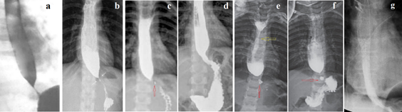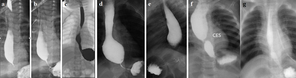 (f-g). Preoperative, and postoperative barium esophagogram of a mid-esophageal congenital esophageal stenosis after successful correction.46