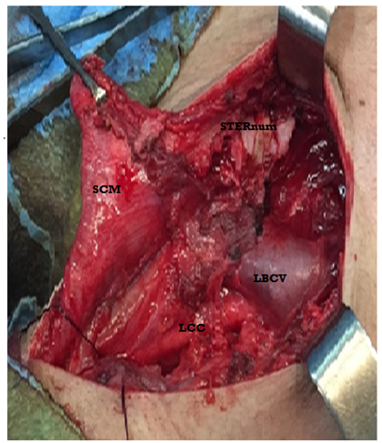 The preoperative evaluation of the colon by colonoscopy was performed in 5patients. Preoperative angiography was performed only in one patient. Nutritional disorders were corrected using nutritional supports before surgery. The surgical procedure used in all patients was a substernal isoperistaltic left colonic interposition. The adequacy of colon graft blood supply was judged peroperatively by inspection, palpation, transillumination of the mesentery and vascular clamping test. It is important to take care of checking constantly the position of the graft vessels to ensure there is no mechanical compression that may impair the graft vascular supply and to select a graft with sufficient length avoiding thus tension at the anastomotic site. The cervical scarred esophageal was completely removed and the cervical anastomosis was performed on healthy tissue using an interrupted single-layer end-to-end hand-sewn anastomosis. The distal anastomosis was performed at the posterior side of the gastric antrum when the stomach is available. An early postoperative enteral nutrition via tube-jejunostomy was introduced 24hours after surgical procedure. The integrity of oesophagocolic anastomosis was postoperatively assessed by barium study between 8th and 10th day. The thoracic inlet was enlarged by removing the left half of manubrium and internal third of left clavicle, resection of the left half of the manubrium and the sternal head of the left clavicle (Figures 1&2). The thoracic inlet was enlarged whenever it was judged too narrow and not allowing the easy passage of three hand fingers. The patients were divided into two groups. G1 with enlarged thoracic inlet and G2 without enlargement. Parameters such as incidence of leakage and stricture of cervical anastomosis, length of hospital stay, graft necrosis, operative time, blood transfusion and blood loss were compared between the two groups.