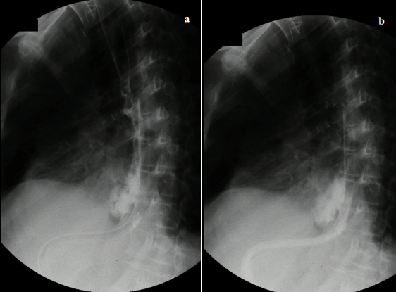 After comprehensive rehabilitation, a methylene blue test identified leakage below the LAMS. A new 12 cm LAMS was inserted, covering the leak and the patient remained on NPO status with enteral nutrition. After 28 days, the LAMS were removed, and no leakage was detected. An esophagogram confirmed an anastomotic fistula (Figure 3), and a new defect measuring 10 mm was managed with a new E-VAC system. The E-VAC system required 9 replacements, but the fistula persisted at a reduced size of 7 mm. Fibrin sealant was used for management. The patient resumed oral feeding after deglutition rehabilitation and showed improved dysphagia. During the last endoscopic follow-up, no leaks or fistulas were observed, indicating a successful procedure (Figure 4).