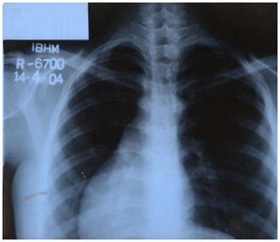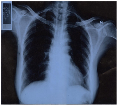 On investigation, her Hb% was 8.7gm%, total count of WBC was 15,000/dl, polymorph was 73% and lymphocyte count was 22%. Urine revealed no abnormality. USG of lower abdomen was done and was reported as normal. Patient was admitted to IBH. After admission she was treated conservatively. On the following day patient had only mild tenderness on the abdomen and discharge from the hospital. On the same night she developed severe pain and was admitted again. She was prepared for emergency appendicectomy. As the patient had complains of amenorrhoea for 3days spinal anesthesia was given. Lanz incision was given and appendix was tired to identify. But after repeated attempt appendix was not found in right iliac fossa. The incision was extended but failed to localize caecum and ascending colon. Some form of congenital anomaly was suspected. General anesthesia was given and the anesthetist identified that her heart beat was on the right side. After confirmation of dextrocardia small gut was followed up and caecum was indentified on the left side. Appendix was found inflamed and appendicectomy was done, recovery of the patient was uneventful. After operation for confirmation of situs inversus chest X ray and USG was done and dextrocardia and situs inversus was confirmed (Figure 1).