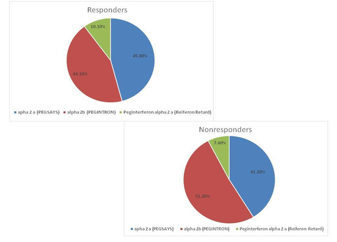 No statistical significant difference was found regarding the type of interferon used between responders and non-responders P value 0.164 (Figure 1).
