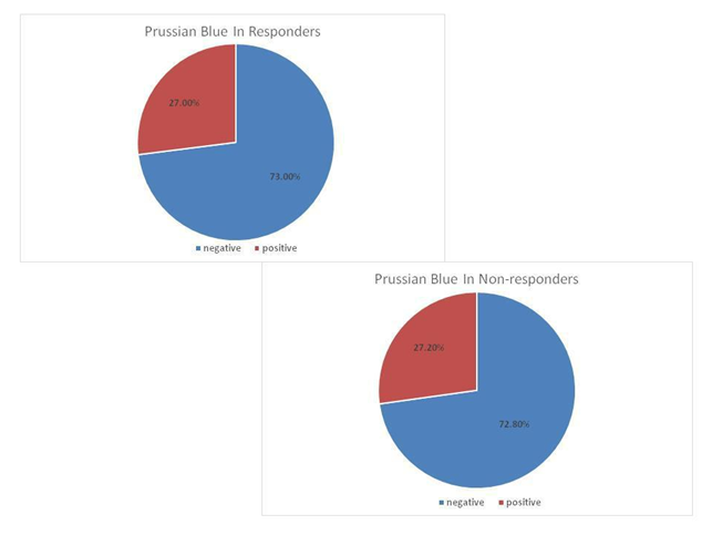 More over when we studied the relationship between HFE gene polymorphisms and Prussian blue results we found no significant association between HFE 193 A>T, HFE 187 C>G, or HFE 845G>A genotypes and Prussian blue results.