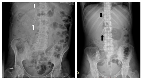 Figure 2 Simple X-rays of abdomen of other patients, with well-positioned metallic (white arrows) and plastic (black arrows) biliary stents.
