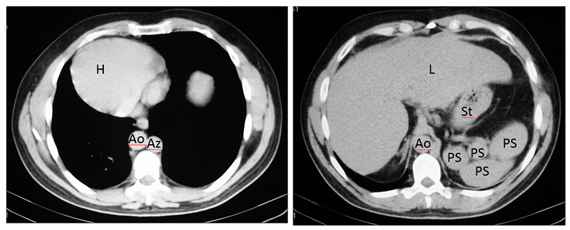 Figure 3 Axial CT images show dextrocardia and cardiac apex on the right (H), the aorta on the right (Ao), azygos vein on the left (Az), liver is midline (L) but slightly on the right and polysplenia (PS) on the left relative to greater curvature of the stomach (St). IVC cannot be identified.