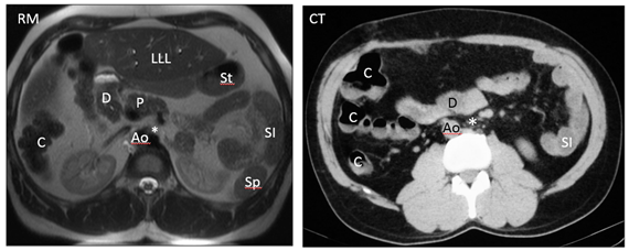 Figure 4 Axial MR and CT images show a prominent left hepatic lobe (LLL), colon on the right (C), small intestine on the left (SI), truncated pancreas (P), left-sided stomach (St), one splenule on the left (Sp), Aorta on the right (Ao) and intestinal malrotation because the duodenum (D) does not pass between the aorta and the superior mesenteric artery (asterisk). IVC cannot be identified.