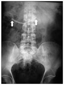 Patients with biliary endoprostheses should be followed up clinically and with imaging, endoscopy or x-ray tests.3 In patients with biliary prostheses and abdominal pain or sepsis, differential diagnosis with perforation should be considered and abdominal x-rays performed.10 In these cases, the most common site of perforation is the duodenum and perforations are usually retroperitoneal.9,18