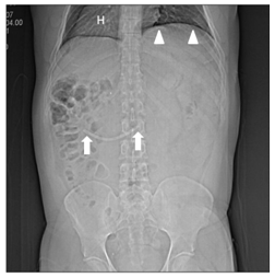 Figure 7 CT projection radiograph (topogram) shows dextrocardia with cardiac apex on the right (H), left diaphragm in a superior position (arrowheads) and the displaced stent (arrows) in a similar location than that seen in the previous figure.