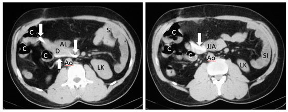 Figure 8 Axial CT images showing the high density migrated stent (arrows), located in the duodenum (D) with end in the jejunonojejunal anastomosis (JJA). Jejunal afferent loop (AL), left kidney (LK), colon (C), small intestine (SI), aorta (Ao).