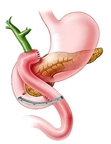 Roux-en-Y hepaticojejunostomy is sometimes performed for biliary reconstruction (Figure 1). For anastomosis to either the common bile duct or the confluence of the hepatic ducts, it is necessary to fashion a Roux-en-Y jejunal limb.8 This limb is identified and transected with a stapling device 30-35cm from the ligament of Treitz. To achieve a stable anastomosis, mucosal contact must exist between the bowel and the biliary tree.