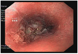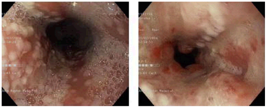 On current presentation, the white blood cell (WBC) count were 11.2 x109 /L and C-reactive protein (CRP) was 115mg/L. An urgent EGD was performed. The EGD revealed severe esophagitis with ulceration which was biopsied and sent for histology (Figure 1).