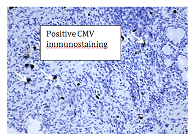 Figure 4 Histology shows characteristic intranuclear inclusions (arrowed), which stain positively with CMV immunostaining.