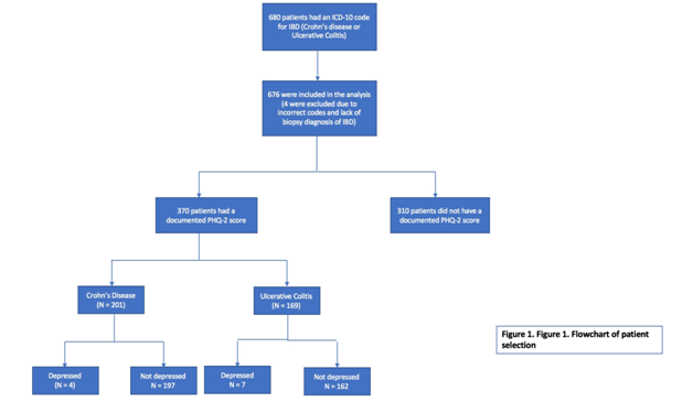 Results: We included 201 (CD) patients and 169 (UC) patients who had PHQ-2 data available. Only 55% (370 of 676) of patients had a documented PHQ-2 score. The prevalence of depression in this study was 3% (11 of 370). There were no significant differences observed between CD and UC patients in regards to gender, age, disease duration, race, or presence of depression. Depression did not vary based on disease severity (p=0.13 for CD, p=0.62 for UC).