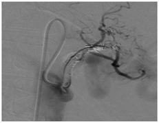 In Aug 2012 he represented and a repeat CT scan showed recurrence of pseudo-aneurysm close to the lesser curve of stomach and distal body/tail of pancreas. Angiogram showed that the pseudo-aneurysm had repurfused despite previous coils in left gastric artery and the left gastric artery was then again satisfactorily re-occluded (Figure 1).