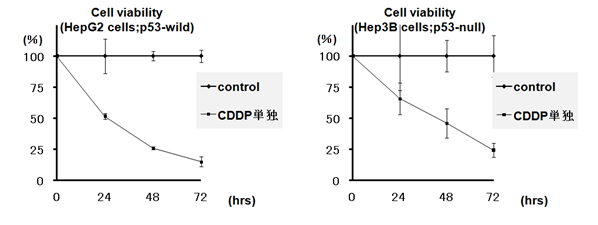 Cytotoxic effects of 2µg /mL cisplatin added to the culture medium were confirmed in both hepatoma-derived HepG2 (wild p53) and Hep3B (null p53) cell lines (Figure 1). Time-dependent decreases in viable cells were observed in both cell lines.