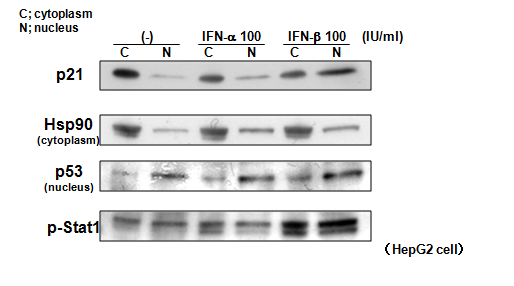 Introduction: Interferon (IFN) has been used for patients with advanced hepatocellular carcinoma (HCC) in combination with chemotherapeutic agents. We previously reported that IFN-βinduced a shift into the nucleus of Cytoplasmic p21 (Cip1/WAF1), known as a tumor-suppressor gene, and contributed to the prevention of HCC.