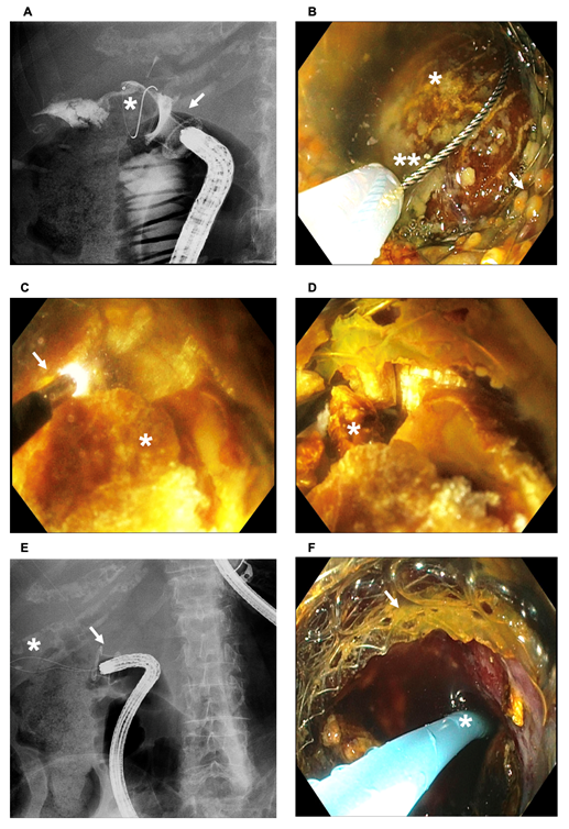 Figure 2 (A) Image taken by fluoroscopy of the 20 mm bile stone lodged (asterisk) in the LAMS (arrow) responsible for early gangrenous cholecystitis in our patient; (B) Spyglass image of the obstructed 20 mm bile stone (asterisk) in the LAMS (arrow) and endoscopic loop (double asterisk); (C) LAMS obstruction electrohydraulic lithotripsy (arrow)(LOL) of the obstructive bile stone (asterisk) through the LAMS; (D) Fragmentation of the lodged lithiasis (asterisk); (E) Passage of an endoscopic loop (asterisk) through the cholecysto-duodenostomy (arrow) after elimination of the lodged bile stone and bile debris; (F) Placement of a double-pigtail plastic biliary stent (asterisk) through the unobstructed LAMS (arrow).