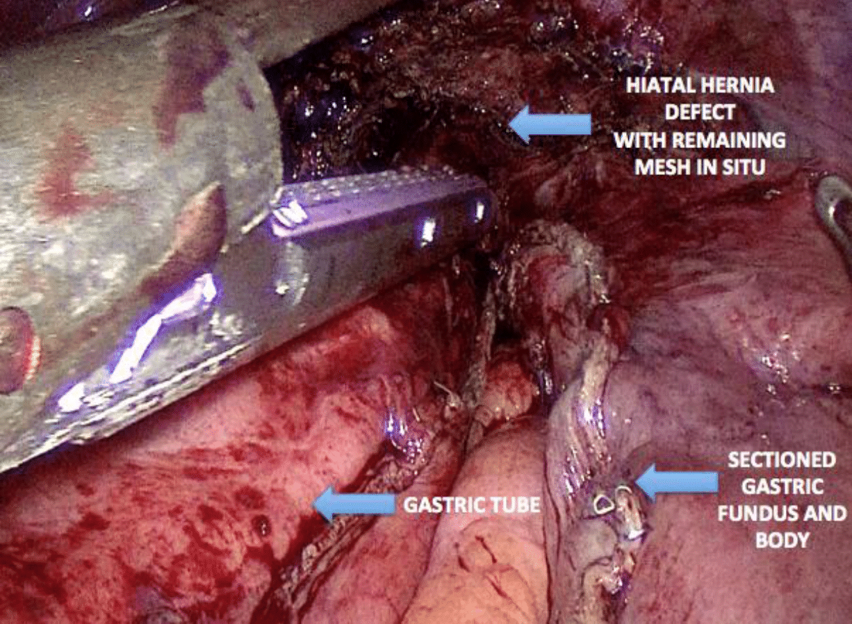 The laparoscopic procedure was similar in all these patients. Pneumoperitoneum was performed with the Veress needle, and two 10mm and three 5mm trocars were used. The diaphragmatic crura were dissected using a harmonic scalpel to reduce and excise the mediastinal hernia sac completely and reduce the herniated stomach. Starting from the gastroesophageal junction, the esophagus is mobilized circumferentially as high as possible in the mediastinum. The omentum was released and ligated from the greater curvature in the middle gastric body with the harmonic device, continuing proximally to the esophagus, dividing the short gastric vessels, cleaning the fat pad to expose the angle of His, and dividing the gastro-splenic and gastro-phrenic ligaments. The crura were approximated with nonabsorbable polyester 2-0 sutures (Ethibond®; J&J) posteriorly and anteriorly as needed. In the case in which previous fundoplication had failed, as in the cases described in this series, it was dismantled to free the gastric fundus and body. When mesh was considered necessary to reinforce the hiatus, a Proceed® (15x15cm) Surgical Mesh (Ethicon J&J) was prepared forming a square sufficiently large to exceed approximately three cm. at each side of the esophageal hiatus. The corners of the square were rounded, and a vertical opening was made in the center to make a keyhole approximately 2 cm. in diameter for the passage of the esophagus or stomach. The prosthesis was fixed with sutures on the crura, to avoid direct contact with the viscera.3 A 36-French bougie was passed down the esophagus close to the lesser curve of the stomach. Starting at the middle of the gastric body, three 60mm blue or green load cartridges of the Endo GIA Roticulator stapler® (Covidien) were used to divide the greater curve down toward the angle of His parallel to the bougie, avoiding strictures and ensuring a straight line. A burying running suture was then placed with 2-0 Stratafix® (Ethicon J&J), creating a gastric tube 8 to 10 cm in length.