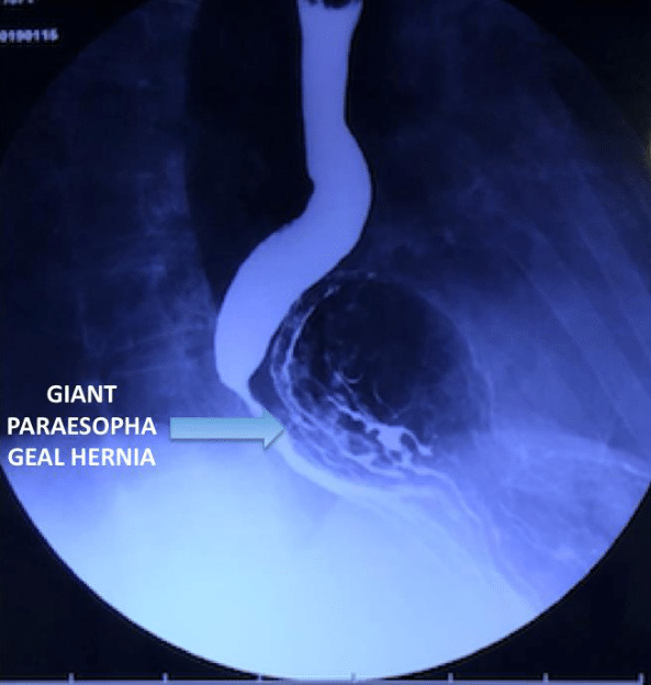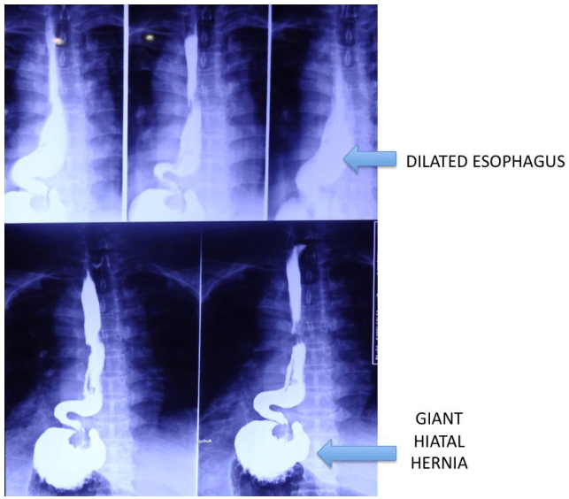 A 55-year-old male patient with a history of duodenal ulcer, pulmonary thromboembolism due to thrombophilic condition after knee surgery, gastric band surgery for morbid obesity which was removed due to dysfunction, and laparoscopic cholecystectomy ten years before his consult with us, came to the clinic due to heartburn and progressive reflux, nocturnal aspiration and persistent vomiting that did not improve with medical treatment. The endoscopy reported a giant HH with an ulcerated esophagus. The upper GI series showed a dilated esophagus confirming the presence of a giant HH in addition to gastroparesis crura were found (Figure 5). Due to the findings and the possibility of recurrence, reconstruction of the hiatus with mesh and a PSG was performed as described before. His recovery was uneventful, six years after surgery he is out of any acid-suppressing medication and has not reported any symptoms related to reflux or HH.