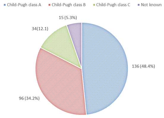 A total of 281 patients were enrolled during the study period. The Mean age of the study population was 56.91 ±7.21years (range: 50–90years) and majority were male (51.6%) and having Child class A 136 (48.4%) followed by child class B 96(34.2%) (Figure 1). Clinical characteristics and laboratory parameters of the study population are shown in Table 1. Majority of patients were from urban areas at district level 161(57.3%) with sindhi ethnicity 176 (62.6%) with poor education under primary 146(52.0%). More than half of the patients 129 (45.9%) were not eligible for antiviral treatment for chronic HCV. In this population major comorbids were dyspepsia 205(73.0%), hypertension 93(33.1%), diabetes mellitus 68(24.2%), chronic HBV 57(20.3%) and Ischemic heart disease 21(7.5%). Most common complication was variceal bleed 95(33.8%) followed by ascities 88(31.3%), pedal edema with portal hypertension and hepatocellular carcinoma HCC 19(6.8%). Most of the patients presented with common symptoms 79(28.1%) followed by routine screening 71(25.3%). Majority of patients presented as decompensated cirrhosis and raised transaminases 160 (56.9%) as shown Table 2. Table 3 shows correlation between age and gender with liver stage and comorbids which shows significant correlation of male gender with comorbids and liver stage at the time of diagnosis.