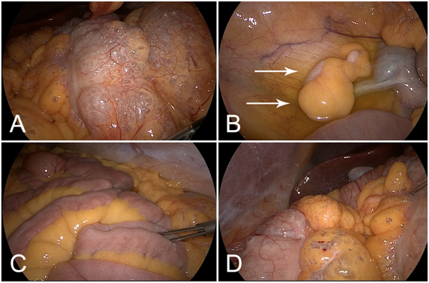 Figure 2 Diagnostic laparoscopy was performed after detection of PI and free abdominal air in the CT scan. (A) Massive pneumatosis predominantly of the transverse colon. B) The appendix (arrows) was inconspicuous. Serous ascites was present. (C) The small intestine was not affected by Pneumatosis. D) Pneumatosis also affected abdominal fat tissue. Liver and gallbladder were without pathological findings.